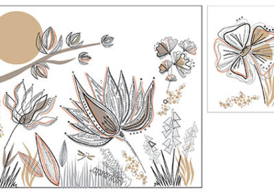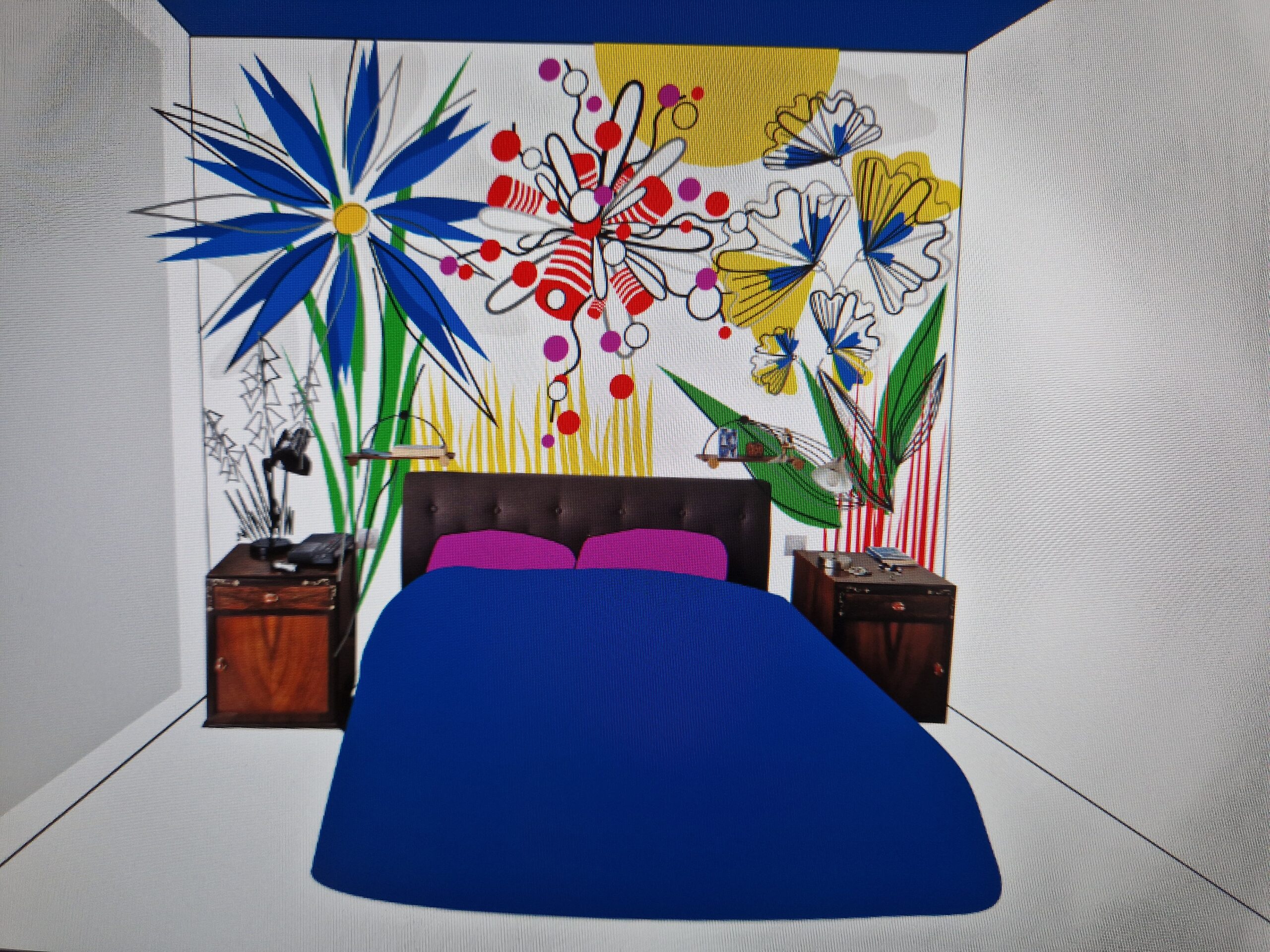 Séduits nous l’avons été immédiatement et elle, l’artiste, pourrait décorer un mur de notre chambre. Lors du rendez-vous à la maison, Sandrine a cerné et compris nos envies : des motifs floraux et de la couleur, en lien avec notre personnalité. La maquette nous a fait pousser des cris de joie, la réalisation a surpassé nos attentes. C’est tout simplement magnifique.